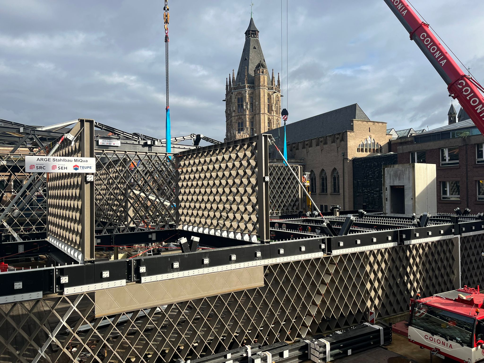 Mit dem Abschluss der Montagearbeiten im Oktober markierte der Einhub des letzten Rautenträgers an der Außenfassade einen bedeutenden Meilenstein für das jüdische Museum "MiQua".