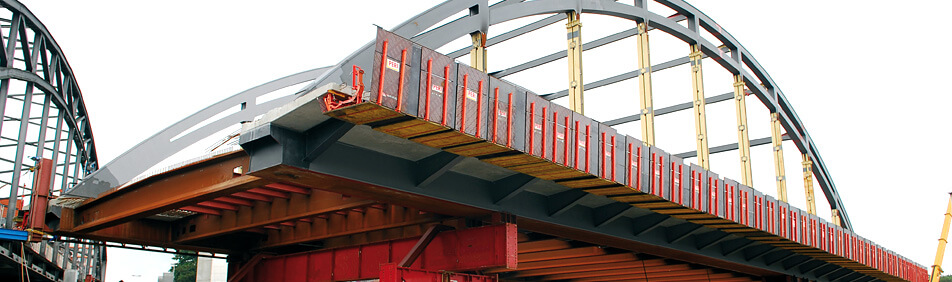 Die Montage der Rampenbrücken erfolgte als Zugmontage direkt vom LKW. Die Montage der Bogenbrücke erfolgte aufgrund der örtlichen Gegebenheiten ebenerdig auf einem Vormontageplatz parallel zu den Bahngleisen. Die Bogenbrücke mit einem Gewicht von ca. 1.700 t (d.h. mit Teilbetonage der Kragarme) wurde anschließend um ca. 6,0 m angehoben, mit Plattformwagen auf dem Vormontageplatz in Verschubposition eingefahren (und dabei um 90° gedreht) und in zwei Sperrzeiten von jeweils 5 Stunden über die Bahngleise eingeschoben. Der Querverschub der Bogenbrücke mit einem Gewicht von ca. 3.200 t erfolgte in einer weiteren Sperrzeit im September 2008.